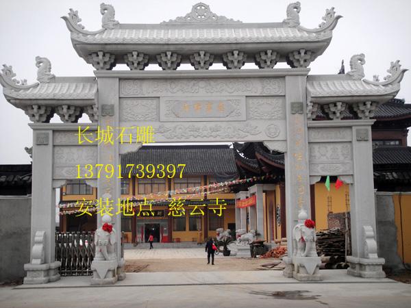 这是座_三间三楼石牌坊,石柱子前后都有夹杆石,也叫抱鼓石,是典型的名长阳石牌坊,横梁上雕刻的有鲤鱼戏水浮雕,上面的横梁雕刻双凤朝阳浮雕,定盘坊下沿雕仰莲瓣,两端安装精美的斗拱,承托边楼楼盖,屋面板沿隐刻出筒瓦形象。