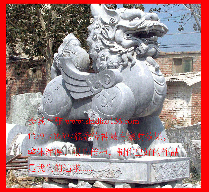 石雕貔貅在风水上用来驱邪、挡煞、镇宅其威力是无庸置疑的。相传貔貅喜爱金银财宝的味道,常咬回金银财宝来讨主人的欢心,故有言此乃招财之物。石雕牌坊上也经常雕刻石雕麒麟。