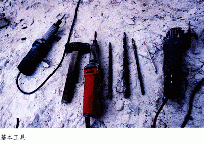 传统石雕工具可分为个人类和公共类。个人类工具很简单,主要有抛荒锤、上细锤、抛荒钎、墨斗、尺子、各种型号的上细钎、各种型号的雕刻刀,另外还有一两根圈头刀和凿子。公共类主要有八磅锤、铁锹、铁楔、砂轮机、打铁炉等。