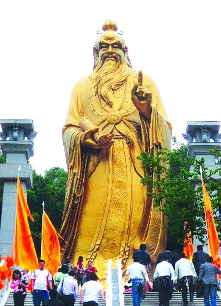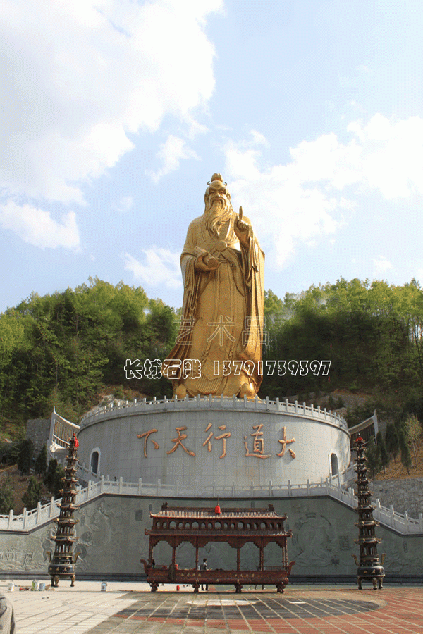 石像的身体比例很独特,正常人似乎没有这样的比例,但看上去绝不会觉得不舒服,因为它整体十分和谐,宛如稳重的大山。老子的眼窝、脸颊充满智慧的力量,和悦、蔼然的情感,是圆融的道义.是坦荡无虑的胸襟。他从容微笑,如岩石般不朽。