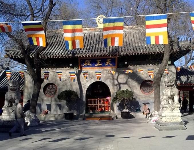 清代石狮因素比较多,可能是清代扩建寺庙时添造的,石狮摆放在山门内、天王殿前。石狮所用石材是精选过的汉白玉石,雕刻工整精细,全身造型圆润浑厚,狮头占五分之二,低头前视,脑门骨起伏,张着大嘴,前腿粗壮后腿略显细小,两层基座,上层是图案丰满的须弥座,下层是雕刻疏密适当的几案式基座。特别之处是双耳后翻,耳中含一络鬃毛,别有特色。胸前雕花缓带上一兽头口衔蜜铃,铃上花纹清晰,古石狮的赛铃是最容易受损伤的部位,这对·石狮的蛮铃能保存完好,其主要原因是石狮地处佛教圣地,受到几十代甚至上百代的僧侣们精心爱护,古石狮从上到下基本没有人为破坏的痕迹。