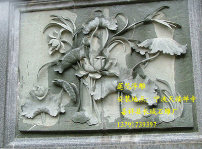 石雕-莲花浮雕在雕刻作品有很好的吉祥寓意,在石雕中应用广泛,莲花,又称荷花、藕花、菌苔、芙蓉、水芝、玉环、泽兰、芙菜、水华、水旦、水芸等。多年长草本,生浅水中。下有根茎,即藕,肥大而长,有节,节间有许多管状空隙;叶人而圆,叶柄抽出水上;夏天在花梗顶端开出大形花朵,花色淡红或白色。