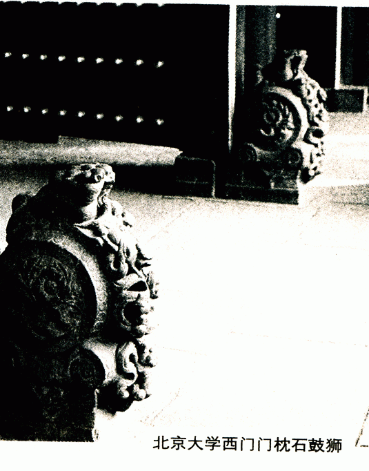 北京大学西门在海淀区颐和园路,门前一对石狮镇守。明清两代窗里是园林。20世纪20年代,此园称燕园,美国人司徒雷登在此建立燕京大学,改建成校园,把图明园废墟中的石狮、华表及一些石刻搬到学校装点环境,西门的石狮就是这样来到学校守门的。