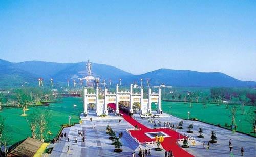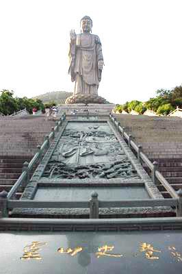 江苏无锡灵山大佛新建巨型大石雕牌坊(也叫石雕牌楼)-灵山大佛坐落在江苏无锡马迹山秦履峰南侧的小灵山南麓。该处原为历史名刹祥符寺之旧址,其整个地形犹如一张太师椅,背靠小灵山,左边青龙山,右边白虎山,北踏青峰,尽揽山形之美,南望太湖,一抱水色之秀,在传统风水理论上,这种“八方风吹不动,一端坐紫金莲”的地形,是大吉之地。相传一千多年前的唐代,玄奘从西天取经归来,游历东南到此,见层峦从翠,景色非凡,大为赞赏,称其“无殊西竺国灵之胜也”!于是就给此山起名“小灵山”。印度的灵山,就是释迦牟尼得道成佛的地方,是著名的佛教圣地,玄奘大弟子窥基在小灵山主持开法,小灵山祥符寺就由此建造并发展起来。石雕牌坊(石雕牌楼,石雕门楼)的匾额和楹联,都是玄妙深奥的佛家言语,其内容蕴含着丰富深刻的佛家精意,发人深思,给人启迪但是,随着岁月的流逝,祥符寺渐渐破旧了。为了保存历史古迹,弘扬佛教文化,在中国佛教协会的关心和大力支持下,由修复祥符寺、建造大佛立像委员会筹划,上世纪90年代初,在恢复祥符寺的同时,开始兴建灵山释牟尼大佛像。在无锡市和国内诸多单位的大力协作下,经过多年努力,1996石年底,灵山大佛终于建成,屹立于小灵山南耸,_并于1997年11月15日一正式开光大佛包括莲花座在内通高88米,相当于一幢30余层楼房的高度,比“山是一尊佛,佛是一座山”的四川乐山大佛还要高出17米,如采加上三层座基,总高度达101.5米,是我国、也是世界上最高的佛像。灵山大佛的佛体和莲花座,全部用锡青铜板块拼装焊接建造,总用铜量达700余吨,仅佛像身体部分就由平均面积5平方米左右的1560块铜板组成。其规模之宏大,气势之雄伟,蔚为奇观。