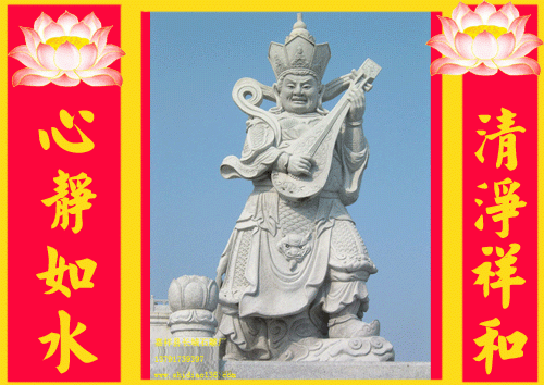 东方持国天王.名多罗托,身着白色,穿甲胃,手持琵琶琴。所谓“持国.是他以慈悲为怀,?;ぶ谏?,以音乐感化众生护持国土。用琵琶弹奏,,使之钵依佛门。东方持国天王手上拿着琵琶,并非天王喜欢弹琵琶。而是取琵琶的弦要调得不紧不松,表示中道,即儒家讲的中庸,代表做可操之过急,像弹琴-样,琴弦太松,弹不了,更不行。儒家讲中庸,佛法讲中道,都是负责恰到好处。